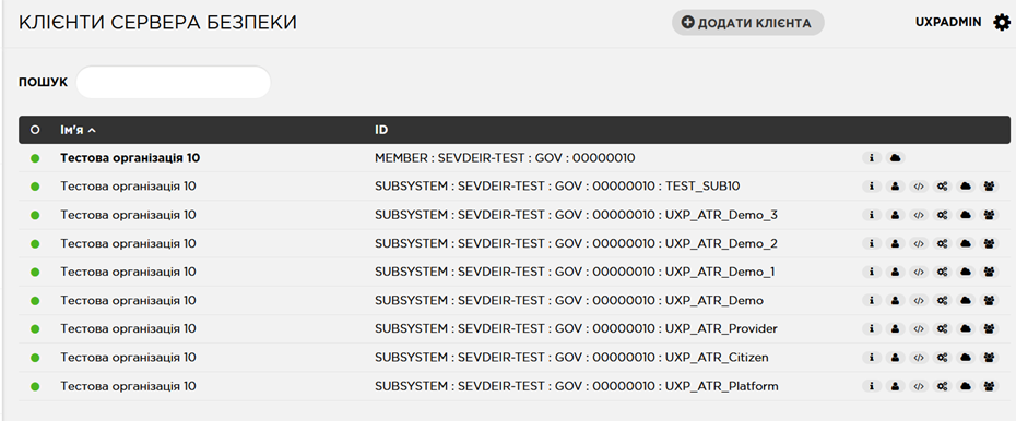 «Клієнти сервера безпеки» – основна вкладка інтерфейсу Адміністратора вебсервісів, що відкривається за замовчуванням після авторизації.