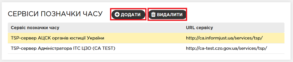 5. Додати сервери позначок часу. Для того, щоб додати новий сервер позначок часу необхідно натиснути на кнопку «Додати» в області «Сервіси позначки часу».