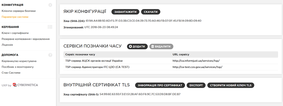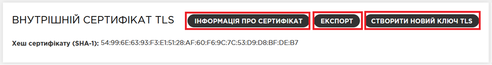 7. Переглянути інформацію про внутрішній TLS сертифікат ШБО. Для цього необхідно натиснути на кнопку «Інформація про сертифікат» в області «Внутрішній сертифікат TLS».