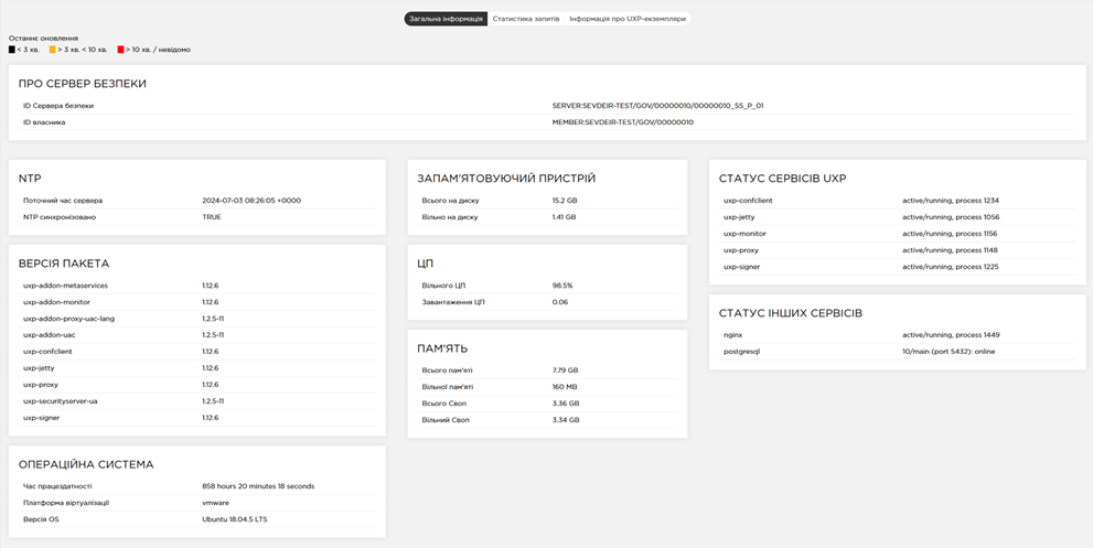 Примітка. Колір параметрів, отриманих системою моніторингу залежить від часу, який пройшов від останнього отримання значення параметру. Чорним кольором позначаються параметри, значення яких було отримано менш ніж 3 хвилини тому, жовтим - параметри, значення яких було отримано менш ніж 10 хвилин тому, червоним - параметри, значення яких було отримано більше 10 хвилин тому, або система моніторингу недоступна.
