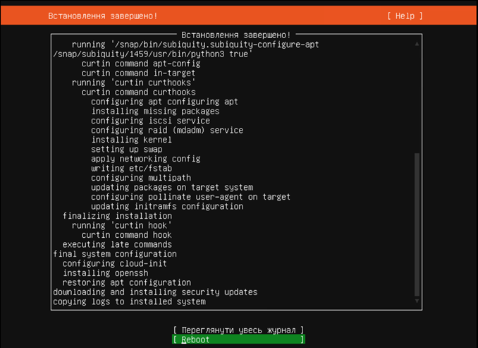 14. Обрати варіант «Reboot» після завершення інсталяції операційної системи: