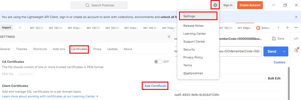 Для того, щоб додати створений сертифікат та відповідний особистий ключ у Postman необхідно виконати наступні дії: