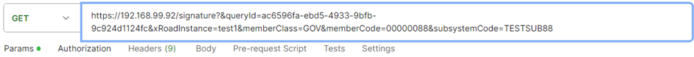 https://192.168.99.92/signature?&queryId=ac6596fa-ebd5-4933-9bfb-9c924d1124fc&xRoadInstance=test1SEVDEIR-TEST&memberClass=GOV&memberCode=00000088&subsystemCode=TESTSUB88