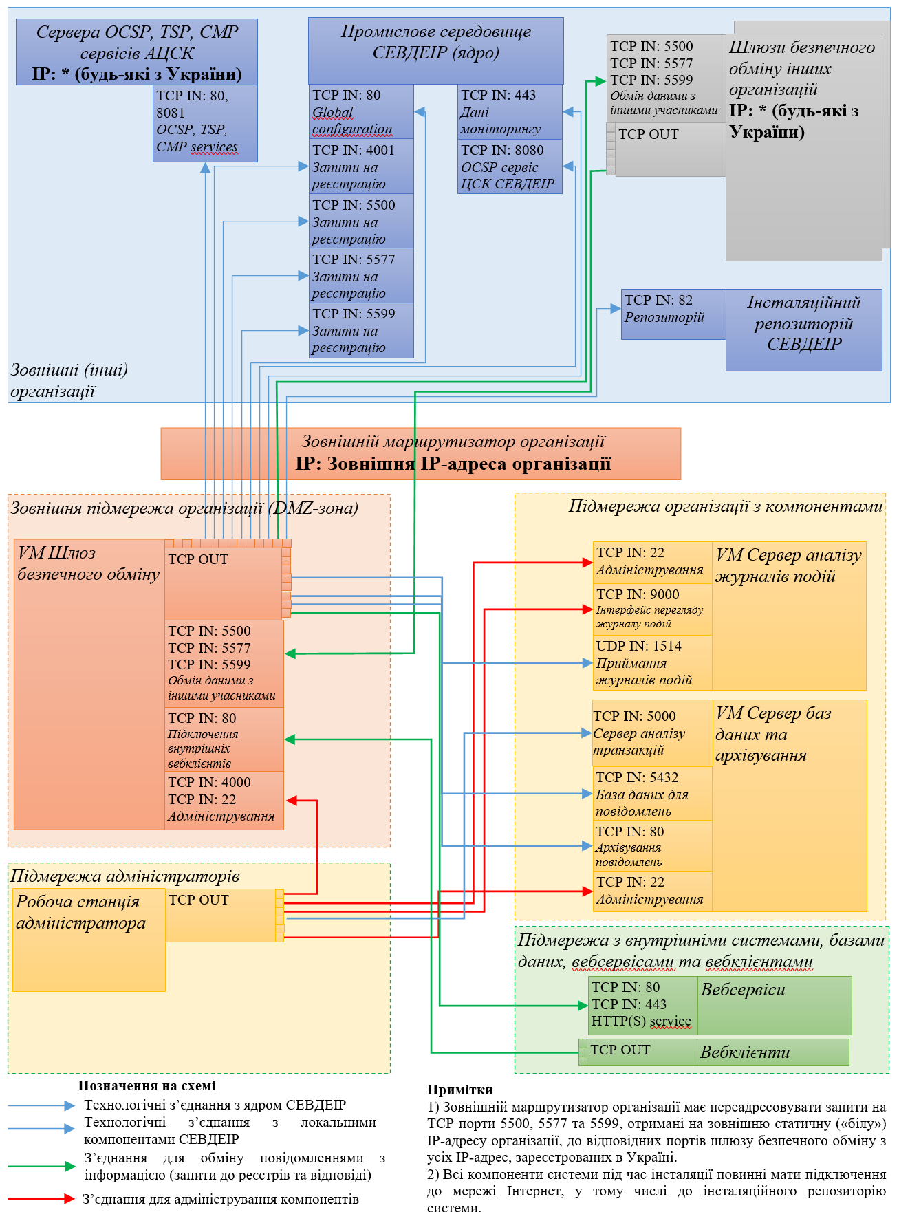Примітка. Обов’язково під час встановлення програмного забезпечення всі зазначені компоненти повинні мати мережевий доступ до репозиторію з програмним забезпеченням учасника СЕВДЕІР. Також зверніть увагу на порт підключення до репозиторію - TCP/82.