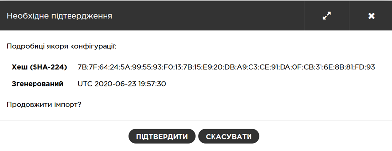 Якір конфігурації необхідно завантажити в наступному діалоговому вікні та підтвердити імпорт, натиснувши на кнопку «Підтвердити» («Confirm»):
