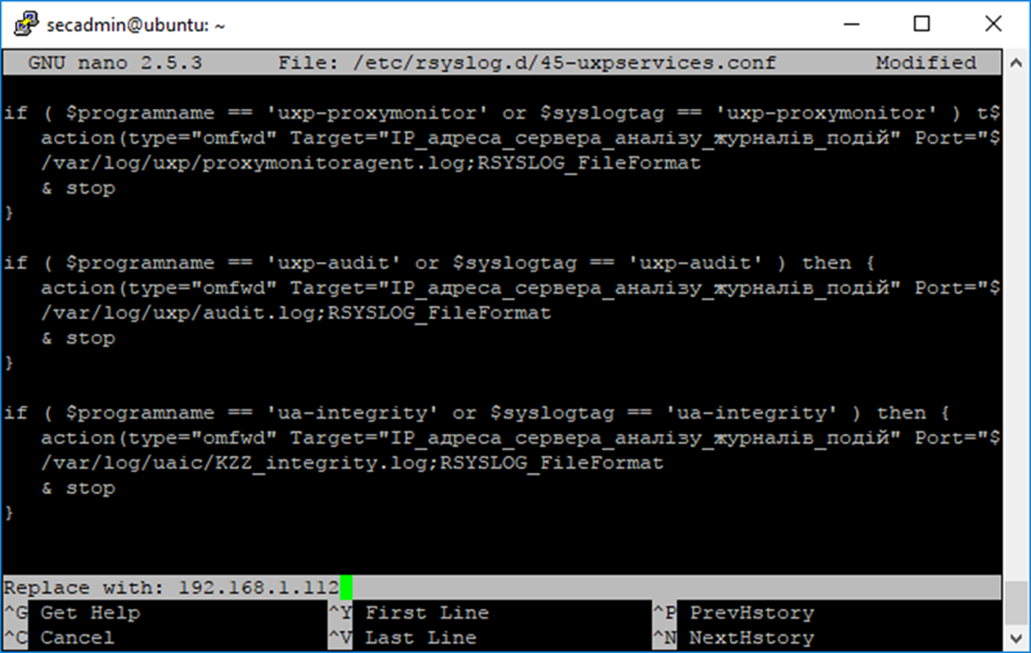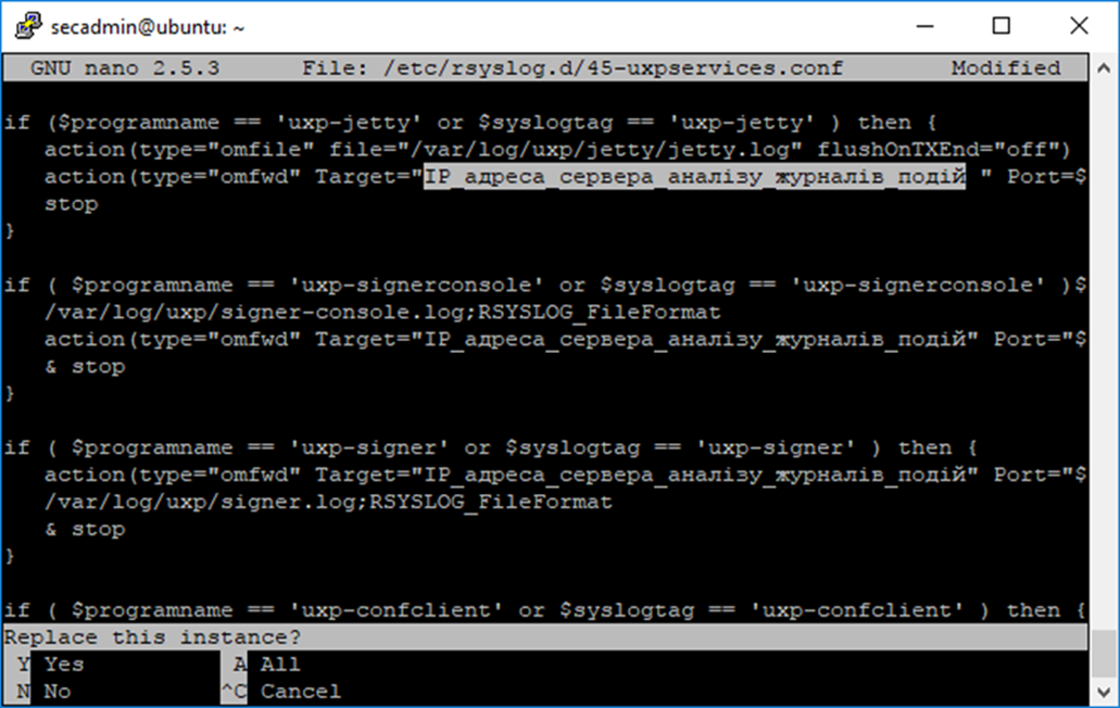 - Натиснути клавішу "Enter" та ввести локальну IP-адресу сервера аналізу журналів подій у поле «Replace with:»: