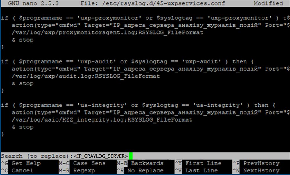 Швидко замінити <IP_GRAYLOG_Server> на локальну IP-адресу серверу аналізу журналів подій можна виконавши наступні дії: