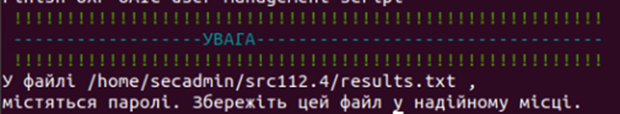 Після того, як скрипт завершить роботу, у директорії /trembita_installation буде створено файл results.txt, в якому містяться усі логіни для всіх компонентів промислового середовища системи «Трембіта»: