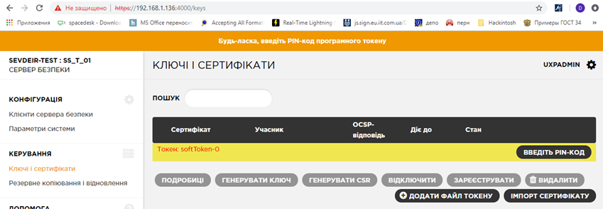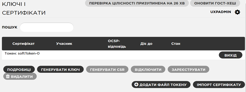ШБО прив’язує всі особисті ключі до токенів безпеки. Після ініціалізації з’явиться помаранчеве повідомлення у верхній частині сторінки з написом «Будь ласка, введіть PIN-код програмного токену». Це повідомлення вказує на те, що зазначений токен безпеки на даний час заблокований, а особисті ключі не можуть бути використані. Щоразу при перезавантаженні ПЗ UXP Security Server або всієї операційної системи ШБО, потрібно вводити PIN-код токену безпеки (у всі використовувані токени безпеки).